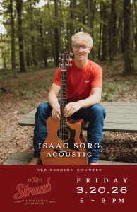 Join us Friday, 3.20.26 | 6–9 PM for an evening of old-fashioned country acoustic with Isaac Sorg.