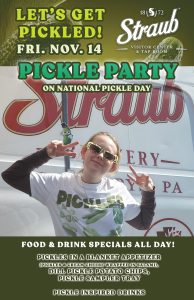 Enjoy Pickles in a Blanket appetizer (pickles & cream cheese wrapped in salami), Dill Pickle Potato Chips, Pickle Sampler Tray, and pickle inspired drinks.